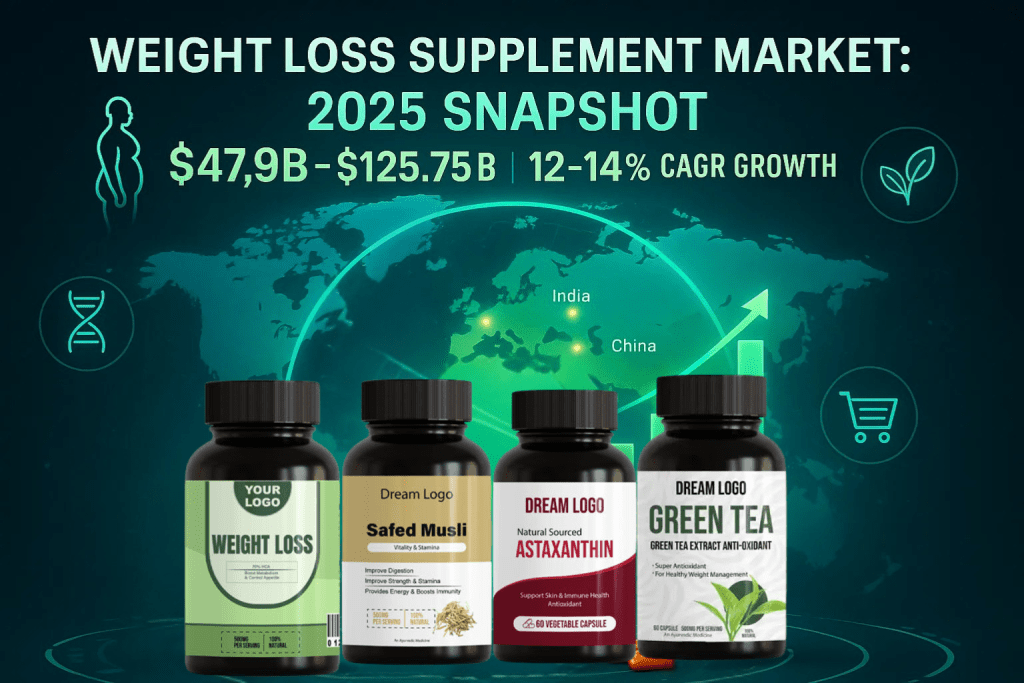 - The global weight loss supplements market is projected to reach between $47.9 billion and $125.75 billion by 2025, growing at a robust 12–14% CAGR due to rising obesity, increasing health consciousness, and disposable incomes.